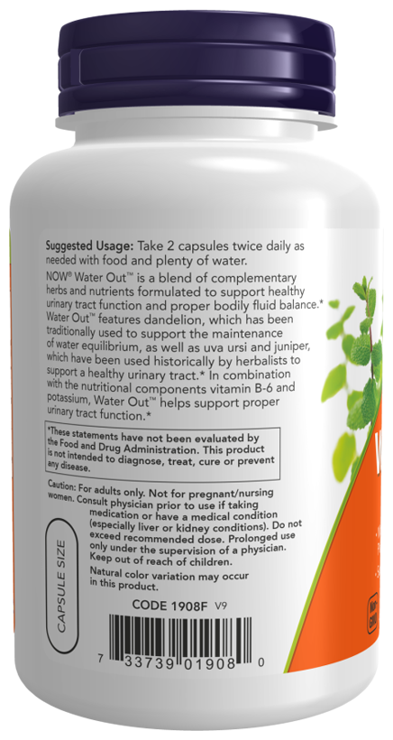 Средство Water Out  - это смесь дополняющих друг друга трав и питательных веществ, разработанная для поддержки здоровой функции мочевыводящих путей и правильного баланса жидкости в организме. В состав Water Out входят одуванчик, который традиционно использовался для поддержания водного баланса, а также толокнянка обыкновенная и можжевельник, которые исторически использовались травниками для поддержания здоровья мочевыводящих путей. В сочетании с питательными компонентами витамином B6 и калием, Water Out помогает поддерживать правильную функцию мочевыводящих путей.