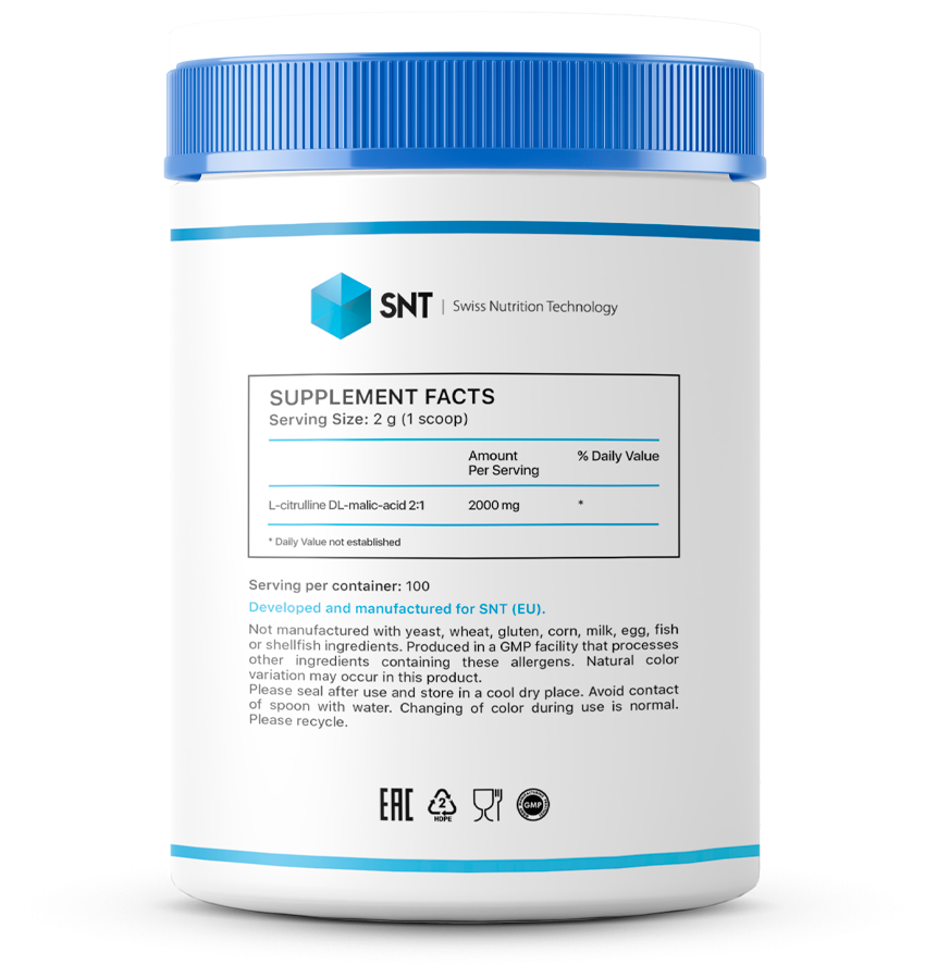 • Улучшенный кровоток - Citrulline Malate может улучшить кровоток и доставку кислорода в мышцы. Это может помочь уменьшить мышечную боль и улучшить время восстановления после упражнений.