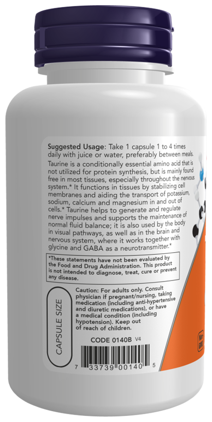 Таурин - это условно незаменимая аминокислота, которая не используется для синтеза белка, но в основном содержится в свободном виде в большинстве тканей, особенно в нервной системе. Он функционирует в тканях, стабилизируя клеточные мембраны и помогая транспортировке калия, натрия, кальция и магния в клетки и из клеток. Таурин помогает генерировать и регулировать нервные импульсы и поддерживает поддержание нормального баланса жидкости; он также используется организмом в зрительных путях, а также в мозге и нервной системе, где он работает вместе с глицином и ГАМК в качестве нейротрансмиттера.