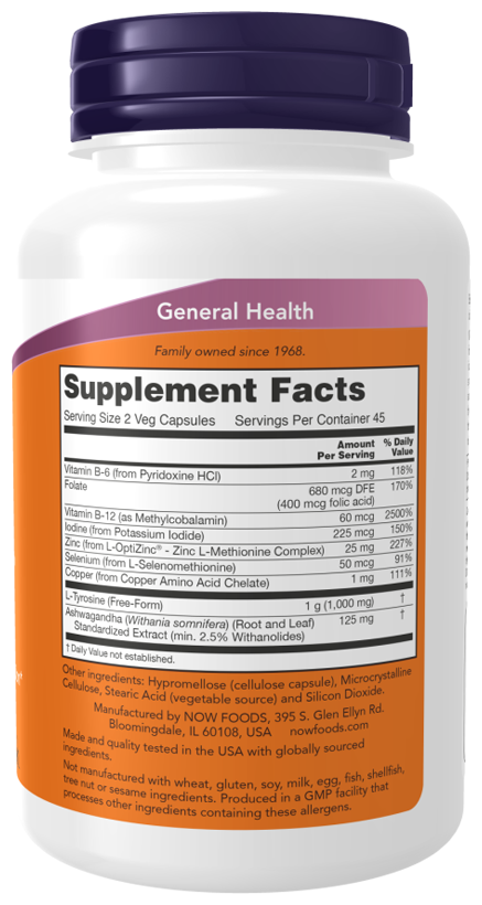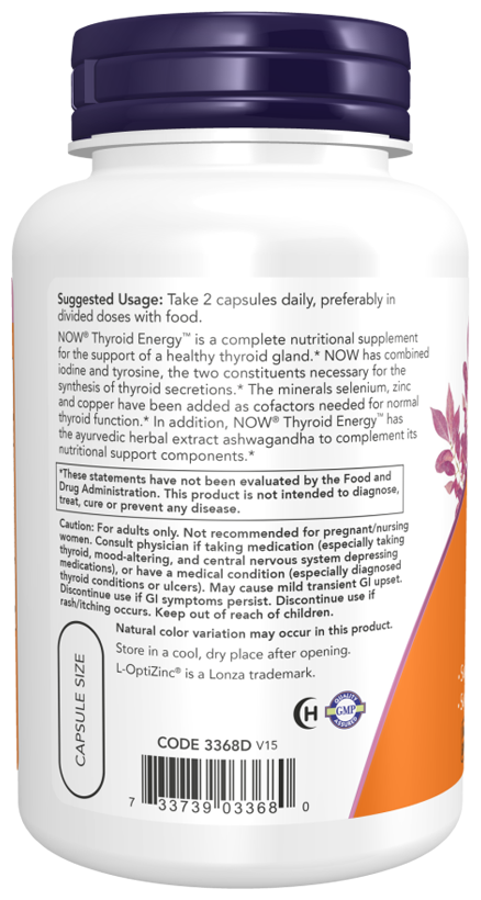 NOW Thyroid Energy - это полноценная пищевая добавка для поддержания здоровой щитовидной железы. NOW сочетает в себе йод и тирозин, два компонента, необходимые для синтеза секрета щитовидной железы. Минералы селен, цинк и медь были добавлены в качестве кофакторов, необходимых для нормальной функции щитовидной железы. Кроме того, NOW Thyroid Energy содержит аюрведический травяной экстракт ашваганды в качестве дополнения к питательным компонентам.